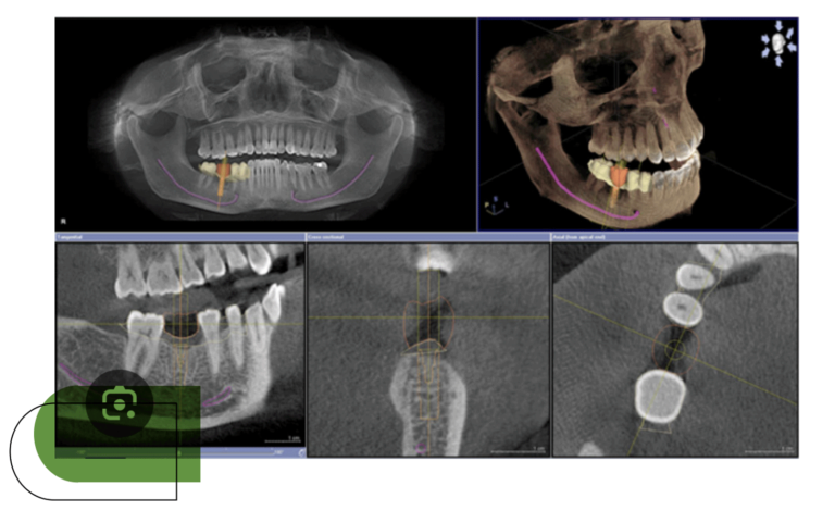 Three-dimensional X-ray of the mouth that allows a precise diagnosis of bone structures and teeth, but also to measure and plan the placement of an implant with the help of a 3D surgical guide.